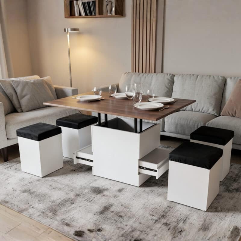 استمتع بحل عملى وأنيق لمشكله المساحات الصغيره ! ترابيزه قهوه من وود واى قابله للطى والفرد تجمع بين التصمصم العصرى والوظيفه الذكيه . يمكن فتحها بسهوله عند الحاجه لتوفير مساحه مريحه عند تناول الطعام مع 4 كرسى بف ثم طيها واستخدامها ك ترابيزه قهوه بسيطه لتوفير المساحه .