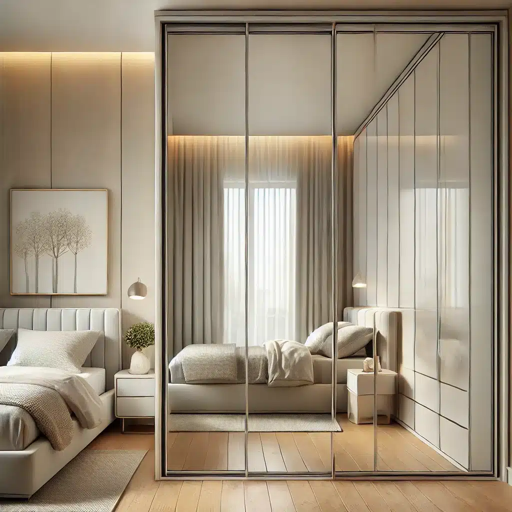 4. المرايا المدمجة: الدولاب المزود بمرايا يعكس الإضاءة ويعطي انطباعًا بمساحة أكبر.