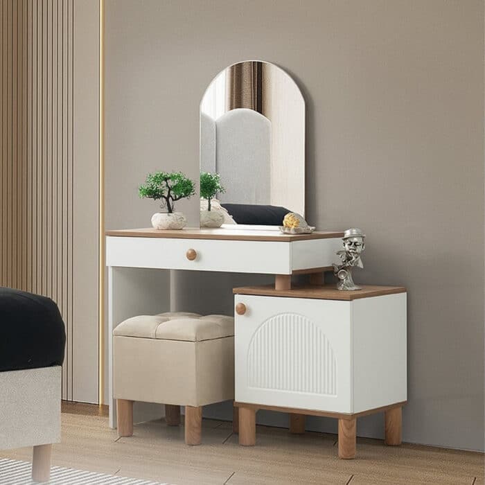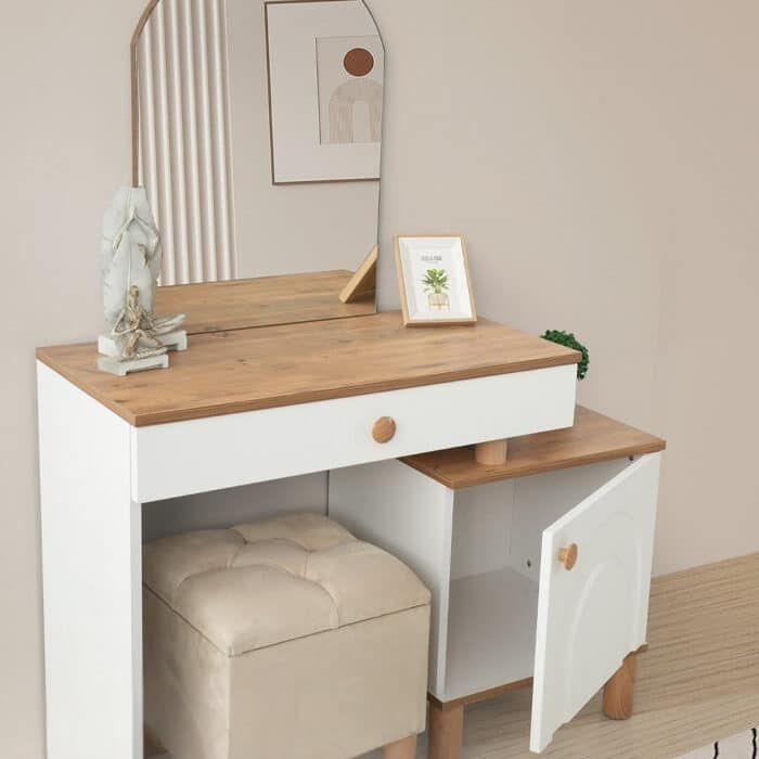 تسريحة أنيقة مزودة بمرآة تضيف لمسة راقية لغرفتك. تصميم عصري يوفر مساحة مثالية لترتيب مستلزماتك اليومية مع مرآة تعكس جمالك بكل وضوح. قطعة فريدة تكمل ديكورك بأسلوب أنيق وجذاب.