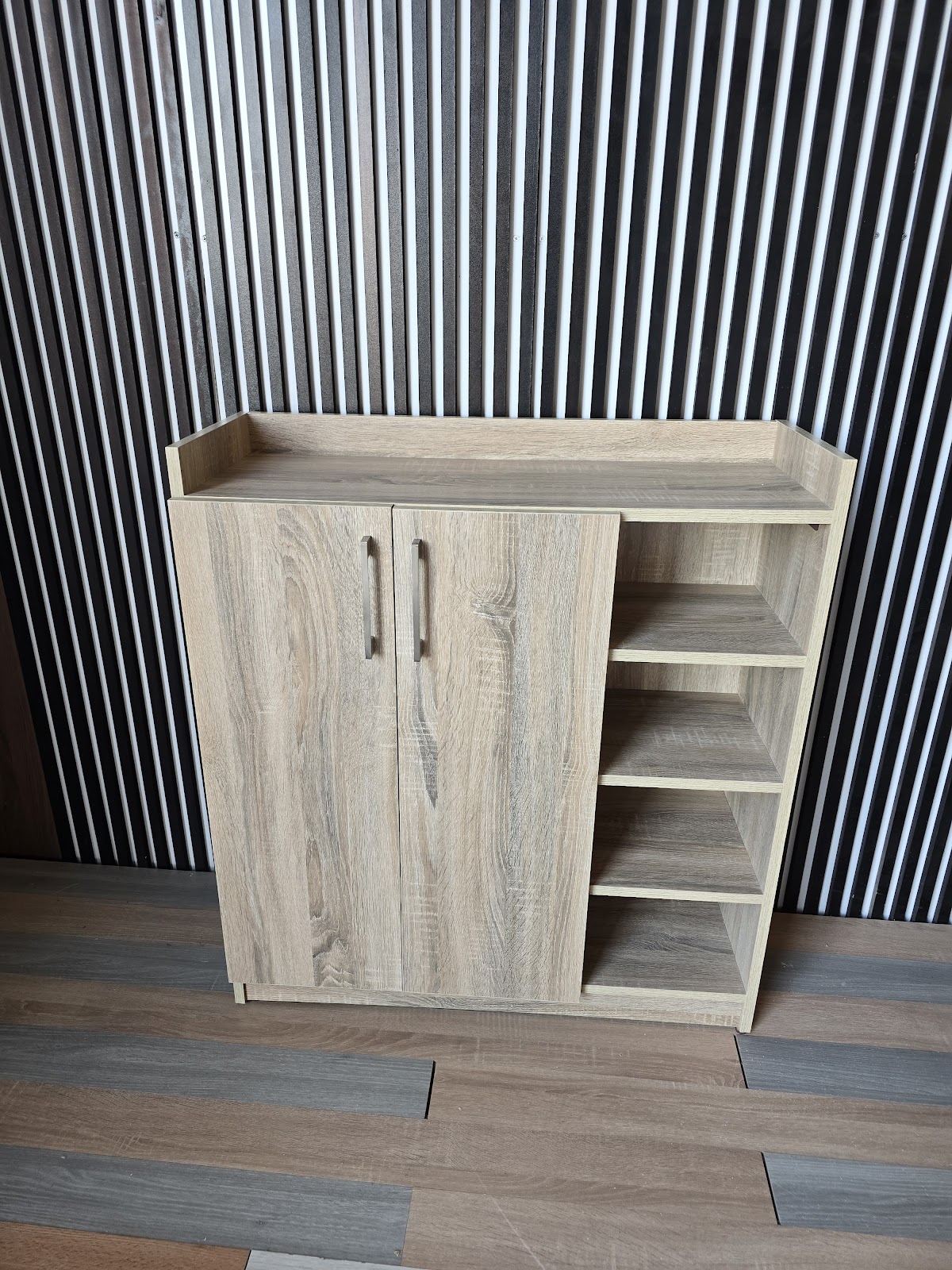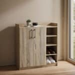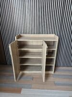 حاملة احذية مستطيلة الشكل بحجم مناسب وباللونين الابيض والبيج الخشبي بتصميم انيق. التفاصيل : الجزامة مستطيلة الشكل بضلفتين مفصليتين مع