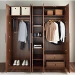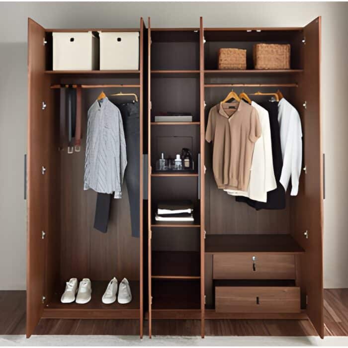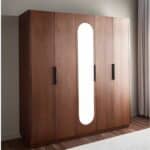 دولاب بتشطيب لون الجوز الغني يضيف دفء ورقي لغرفتك. المرآة الطويلة في المنتصف بتجمع بين الجمال والوظيفة.