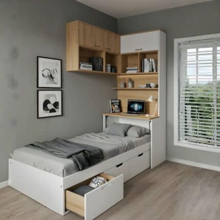 غرفة نوم أطفال وشباب تتكون من سرير باللون الابيض والبيج الخشابي ودولاب كبير يحيط به لإضفاء الأناقة على مظهر الغرفة