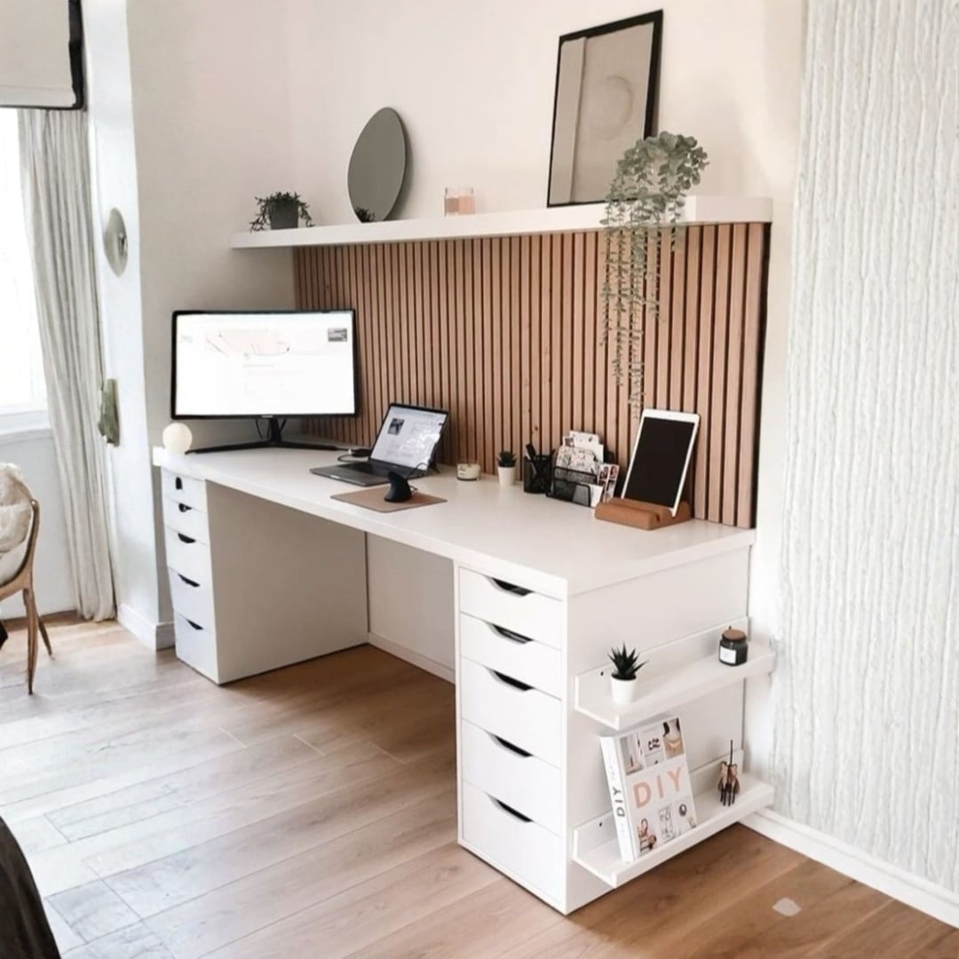 مكتب عملي أنيق عصري جداً في تصميمه ومساحته مناسبة جداً للعمل والمذاكرة، سيساعدك في الحفاظ على نشاطك وتركيزك طوال اليوم، مصنوع من خشب ام دي اف عالي الجودة والتحمل وحائط ديكوري بديل الخشب مما يضمن بقائه لسنوات عديدة مع وجود مساخات تخزين